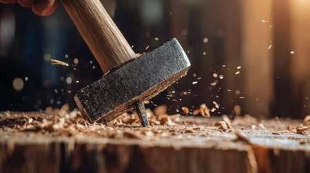A hammer striking a nail into wood, representing the lasting impact of craftsmanship