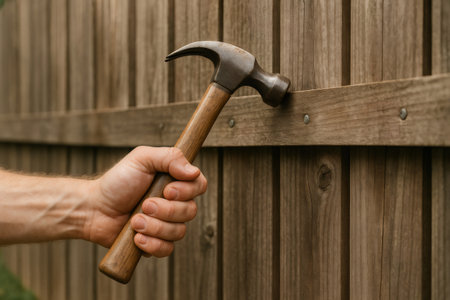 Hand holding a hammer impacting a wooden fence, symbolizing maintenance, home improvement, and repair work