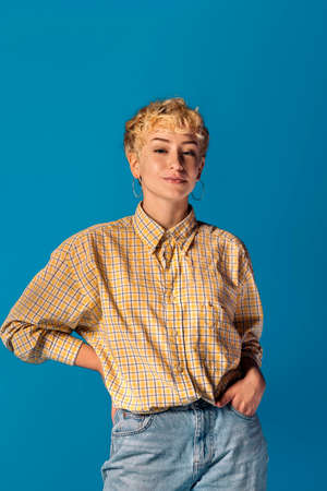 Portrait of a guy with colorful neon light on green studio background. Male model with calm and serious mood. Facial expression, cyberpunk, millenials lifestyle and look like. Future, technologies.