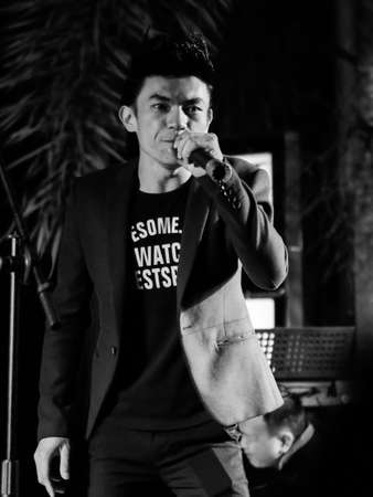Young Asian man wearing white shirt shouting because of anger. Close up head and shoulders, monochrome black white image