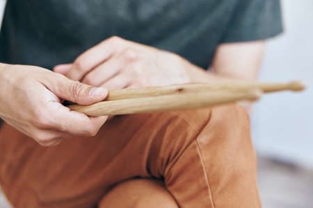 Man holds drum sticks, drummer, musical instruments.