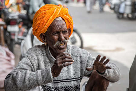 Jodhpur, Rajasthan, India - February 23, 2015: Portrait of an old man in the streets of Jodhpur with a traditional turban