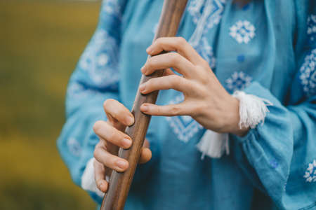 Woman playing woodwind wooden flute - ukrainian sopilka outdoors. Folk music, culture concept. Musical instrument. Lady in traditional embroidered shirt - blue vyshyvanka.