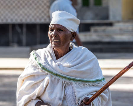 Aksum, Ethiopia - Feb 09, 2020: Ethiopian People at Church of Our Lady St. Mary of Zion, the most sacred place for all Orthodox Ethiopians in Axum, Ethiopia.