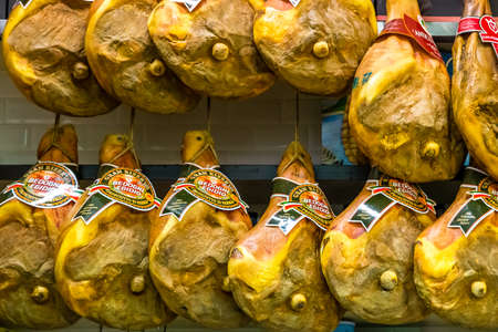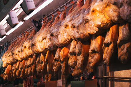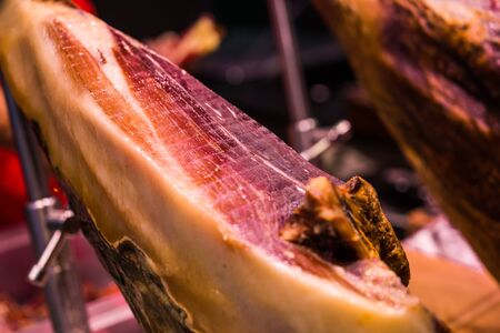 SPAIN, BARCELONA, MARCH, 2021 - Spanish traditional iberico jamon premium meat on the La Boqueria market, Europes largest and most famous food market, Barcelona, Spain