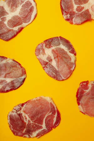 Jamon slices on orange background, top view