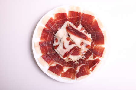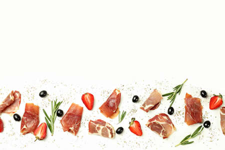 Sliced Pork ham. Fresh prosciutto. White background. Top view.