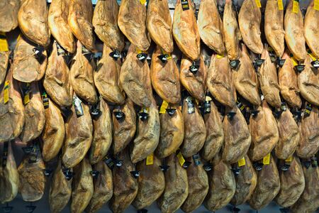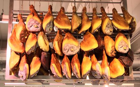 Many cured ham, pig legs, hanging for sale. Real delicious gourmet appetizer in Italian, Spanish cuisine. Food background with copy space