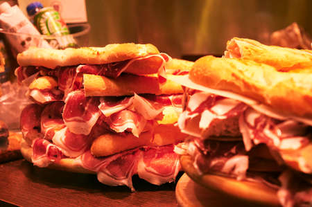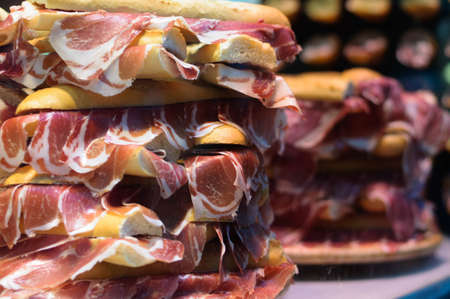 Stack of serrano iberico ham sandwiches on display at a local sandwich shop in Bilbao, Biscay, Basque Country, Spain