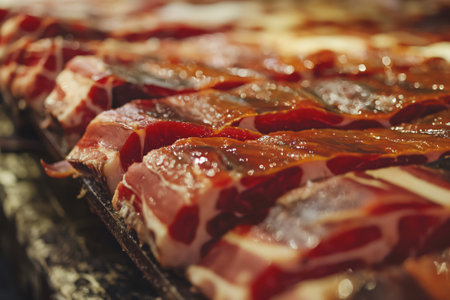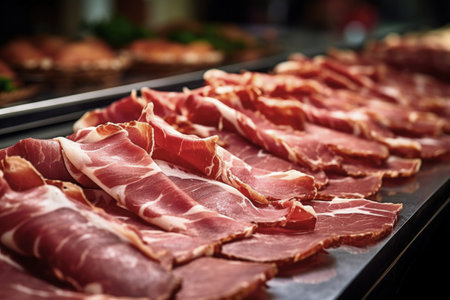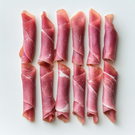 Delicately arranged thin slices of cured meat showcase rich colors and textures, tempting the viewer with their savory appeal. Perfect for a charcuterie board.