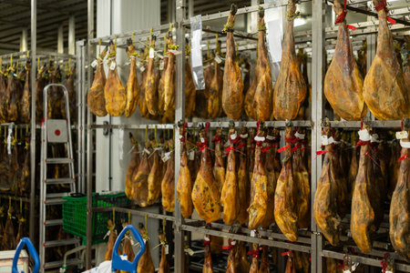 Rows of delicious spanish iberian ham are curing in preparation to be thinly sliced and served at the perfect temperature