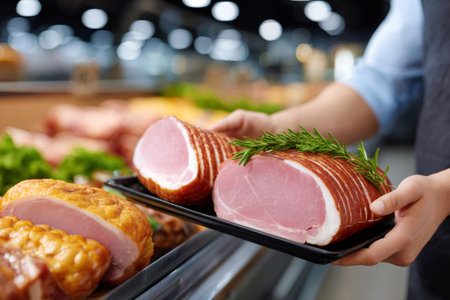 Butcher putting fresh ham cuts with rosemary on a tray in a chilled display case