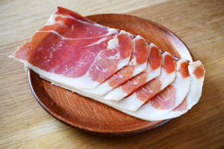 Slices of jamon on wooden board. gluten free product.