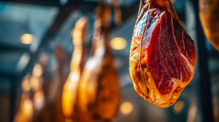 Jamon hangs on crossbar in supermarket. Blurred background