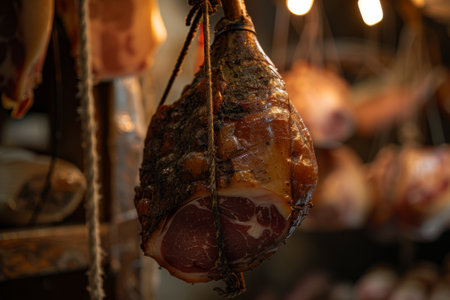 An artisanal dry-cured ham hangs amidst warm glow in a rustic cellar, showcasing traditional methods of meat aging with focused depth and comforting ambiance.