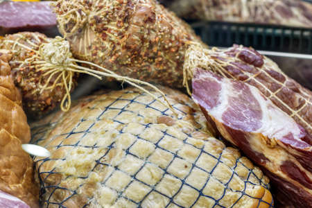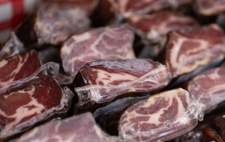 Speck - smoked pork meat wrapped in transparent plastic for sale at the Bolzano market. Italy