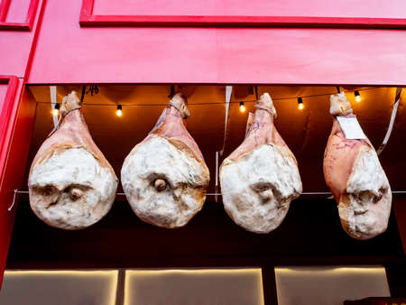 Jamon legs (Spanish ham) meat hanging in the shop. Traditional spanish dish jamon iberico.