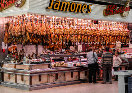 OCT 29, 2012 Valencia, Spain - Jamon ham store and seller in Valencia Central Market or Mercat Central. Builted in 1914, one of the largest market in Europe.
