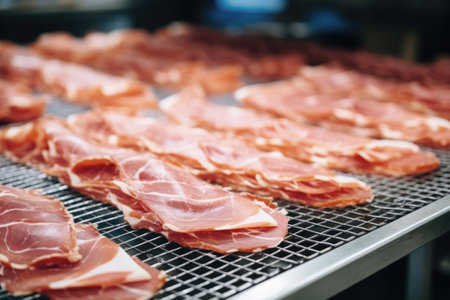 Meat processing plant. Slices of fresh bacon and mint slices on a conveyor belt in the workshop. Arrival of jamon or cold cuts. Production of pork or beef in a modern enterprise