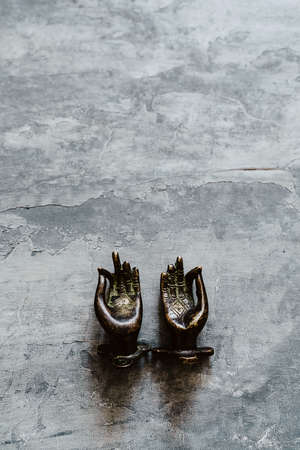 metal door handles in the shape of hands folded in mudra, shot on a textured gray background, close-up, separate object, yoga theme, bronze shade, Indian motif