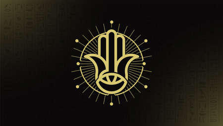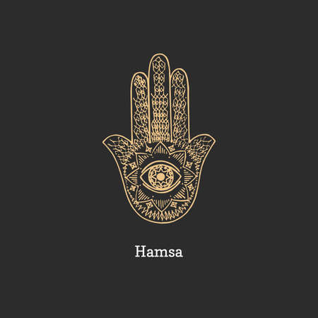 Ornate hand drawn hamsa. Popular Arabic and Jewish amulet in gold and black. Vector illustration.