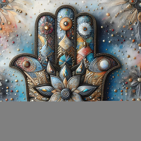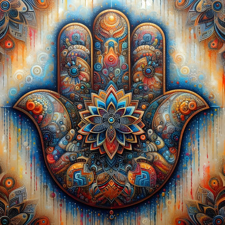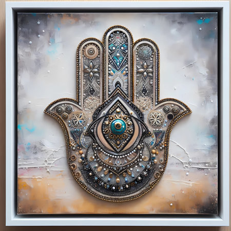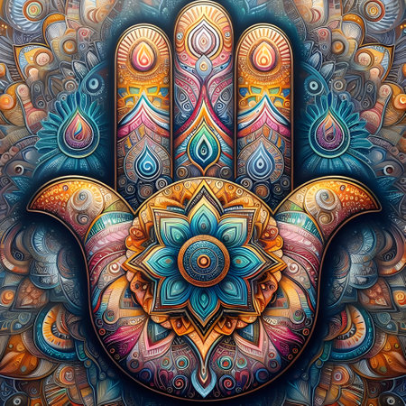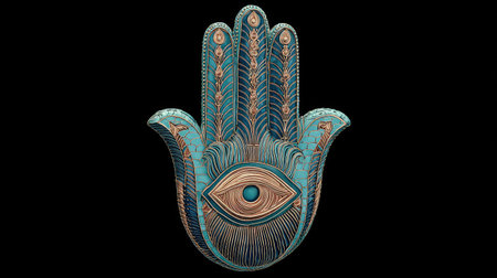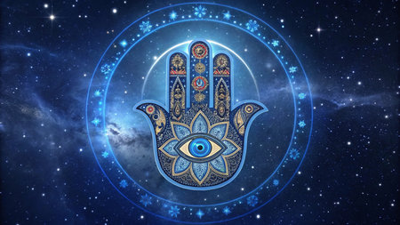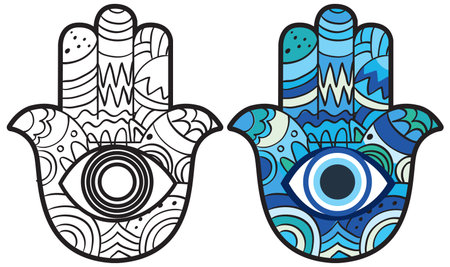 Two stylized Hamsa hands, one colored in blue, with intricate patterns and central eye motif