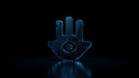 3d rendering wireframe digital techno neon glowing symbol of hand with eye inside with shining dots on black background with blured reflection on floor