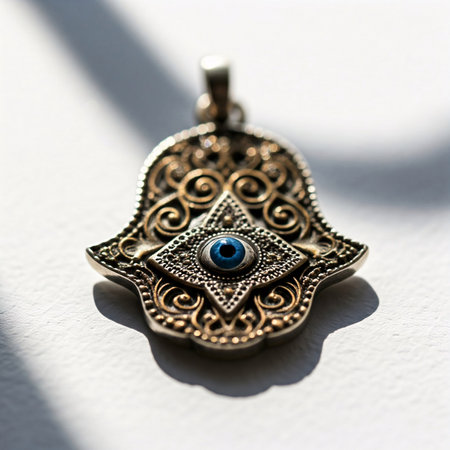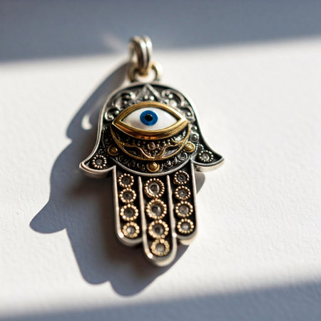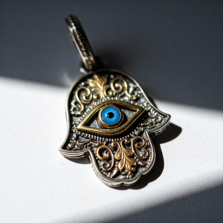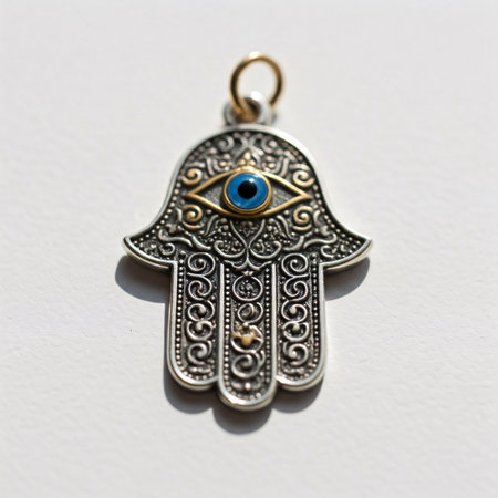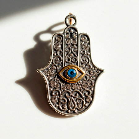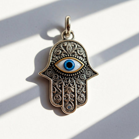 Jewelry pendant in the form of an eye on a white background Jewish protection hamsa