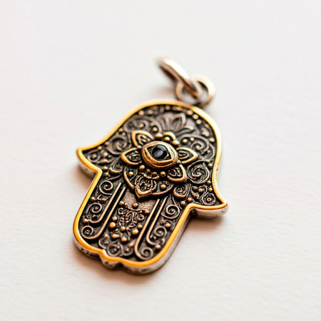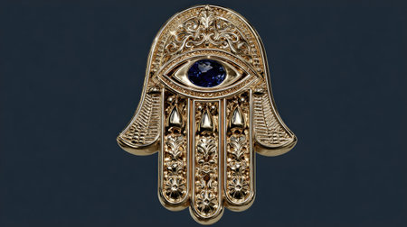 A gold hamsa hand pendant sitting on top of a black stone, AI