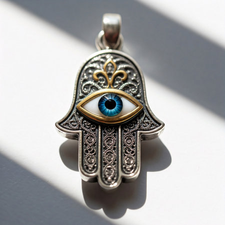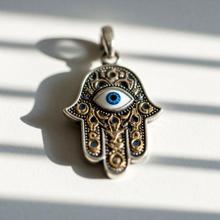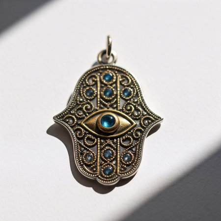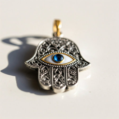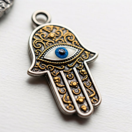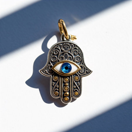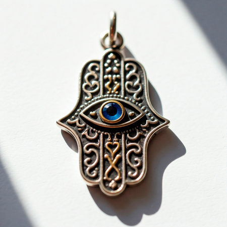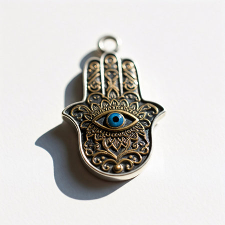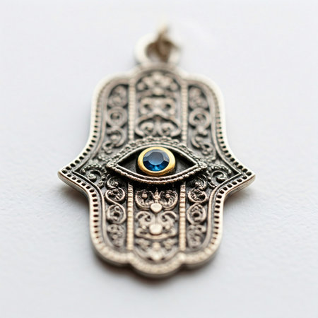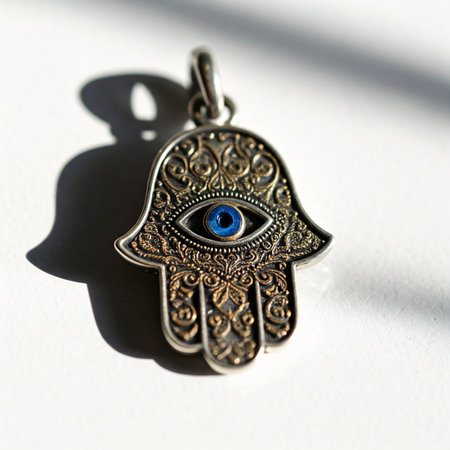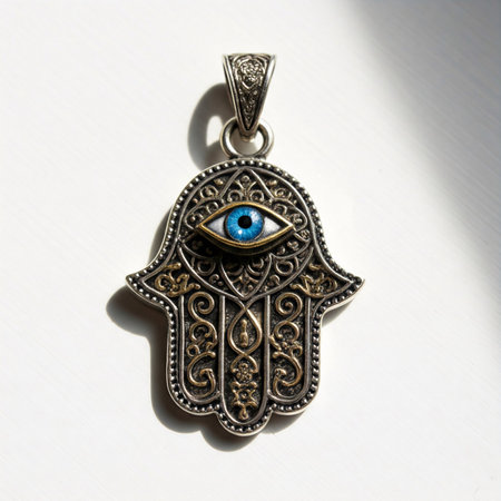 jewelry pendant with a blue eye on a white background Jewish protection hamsa