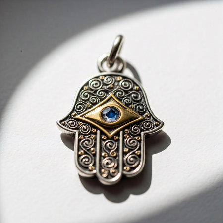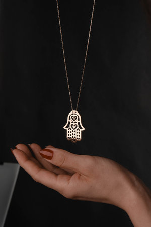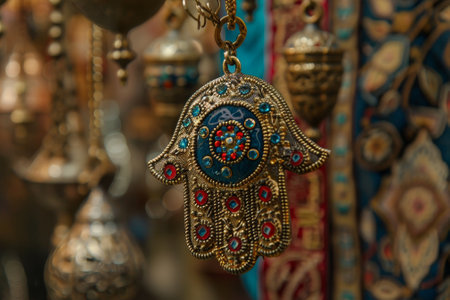 A gold and blue hamsa hand is hanging from a chain. The hamsa is a symbol of protection and good luck