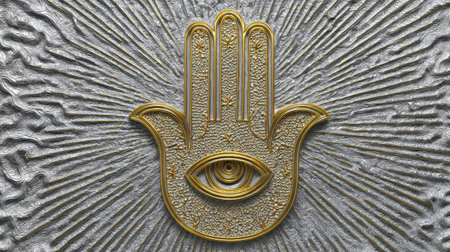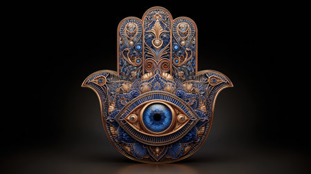 Hamsa hand with eye. 3D illustration. Sacred geometry.