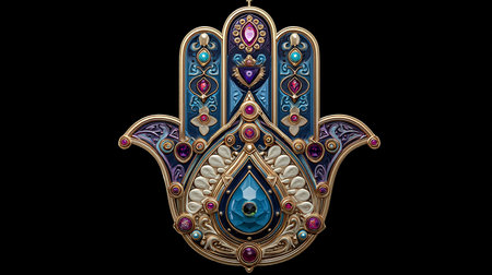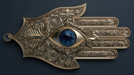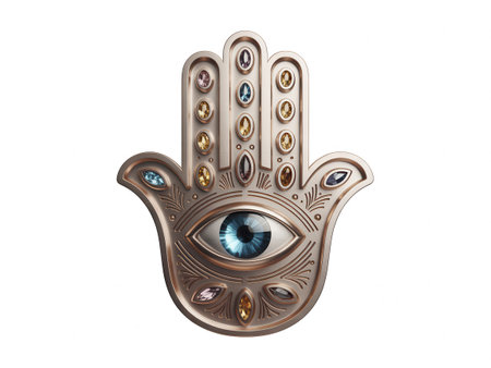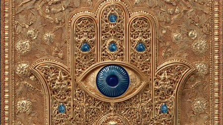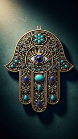 A detailed metallic Hamsa hand symbol with a realistic blue eye and colorful gemstone inlays on a white background.