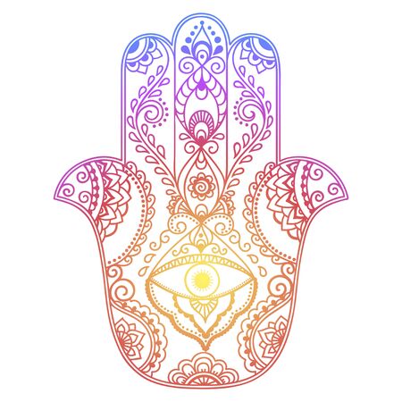 Colorful Hamsa hand drawn symbol with flower. Decorative pattern in oriental style for interior decoration and henna drawings. The ancient sign of Hand of Fatima. Rainbow design on white background.