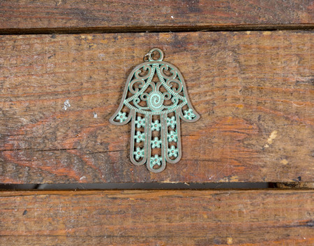 sterling silver metal pendant on natural background in the shape of hamsa, fatima hand