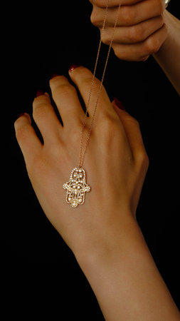 closeup the hand of a man holding an old hamsa amulet, also known of the hand of fatima or the hand of mary, on a black mottled background