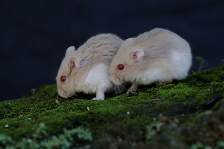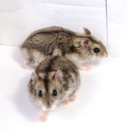 Closeup of two small funny miniature jungar hamsters sitting on a floor. Fluffy and cute Dzhungar rats at home.