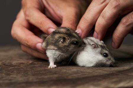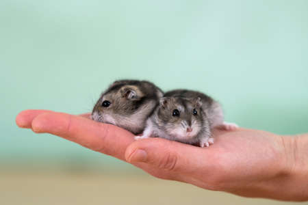 Closeup of two small funny miniature jungar hamsters sitting on a woman's hands. Fluffy and cute Dzhungar rats at home.