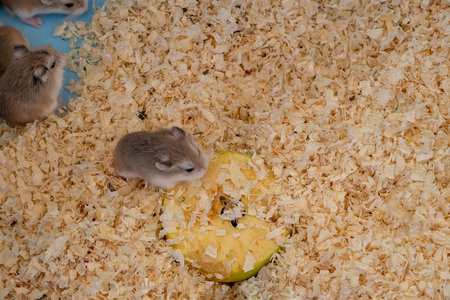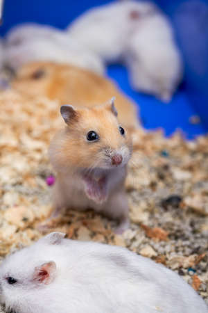 Gray and white hamsters sit on sawdust. Small hamsters on wood shavings. A brood of rodents. The offspring of mice. Cute pets.