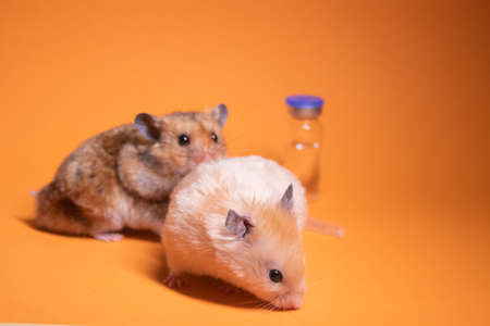 two hamsters-mouse, brown and beige, near medical syringe with a needle and bottle-phial isolated on orange background. medical experiments, tests on mice. veterinary. vaccine development. copy space