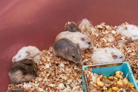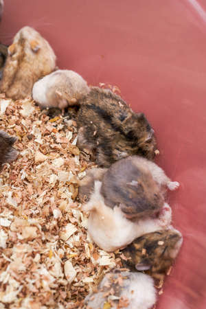 a cell of toddlers multi-colored Dzungarian hamsters.
