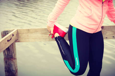 Athlete woman doing some stretching exercises legs before running on outdoor.