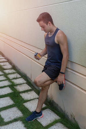 young fitness athlete resting on the wall and having a small coffee to relax on a sunny day