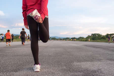 Shot of young fitness woman stretching right legs before run on the runway. Woman warming up in the evening. Sport and Healthy concept.
