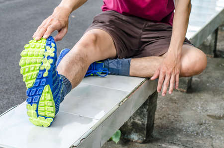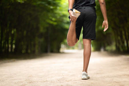 Man workout and wellness concept : The asian runner warm up his body before start running on road in the park. Focus on shoe. Shot in morning time, sunlight and warm effect with copy space for text or design