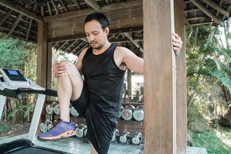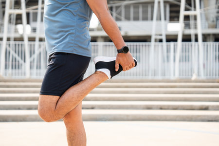 Young asian man wearing sportswear running outdoor. Portraits of Indian man stretching leg before running on the road. Training athlete work out at outdoor concept.
