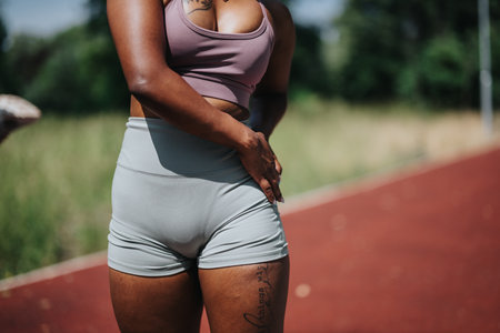 A sporty woman stands at the stadium. Girl's legs close up. Cardio training, healthy lifestyle. Athletics and fitness.