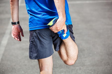 Stretch those quads out. Closeup shot of an unrecognisable man stretching his legs while exercising outdoors.