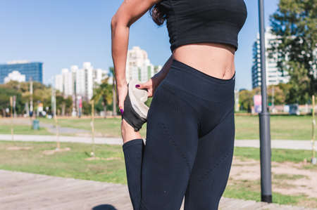 Cropped image of a sporty woman stretching her leg muscles during a morning workout in a city park on a sunny warm summer day. Sport, body positivity and a healthy lifestyle to keep fit