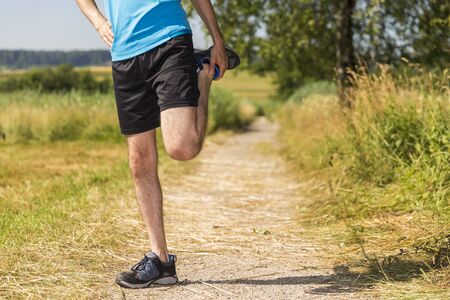 Sporty man warming up and stretching legs before workout outdoors at sunset or sunrise. Stretching gluteus maximus muscle. Athletic man doing fitness stretching exercises. Sport and healthy lifestyle
